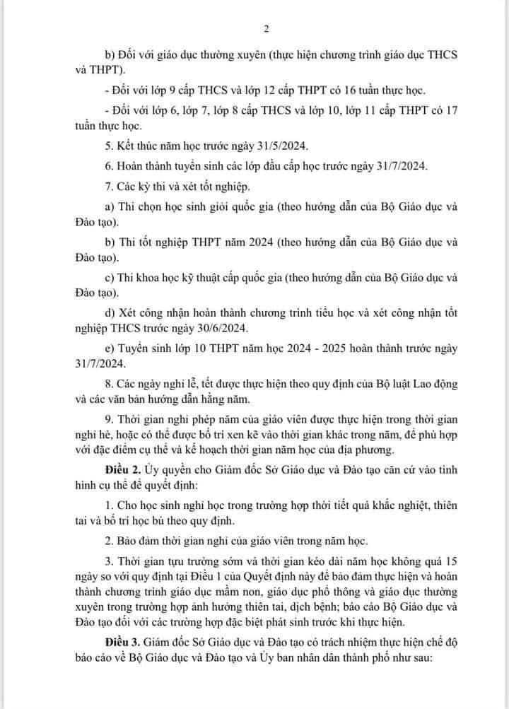 UBND thành phố ủy quyền cho Giám đốc Sở Giáo dục và Đào tạo căn cứ vào tình hình cụ thể để quyết định cho học sinh nghỉ học trong trường hợp thời tiết quá khắc nghiệt, thiên tai và bố trí học bù theo quy định; bảo đảm thời gian nghỉ của giáo viên trong năm học; thời gian tựu trường sớm và thời gian kéo dài năm học không quá 15 ngày so với quy định tại Điều 1 của Quyết định này để bảo đảm thực hiện và hoàn thành chương trình giáo dục mầm non, giáo dục phổ thông và giáo dục thường xuyên trong trường hợp ảnh hưởng thiên tai, dịch bệnh; báo cáo Bộ Giáo dục và Đào tạo đối với các trường hợp đặc biệt phát sinh trước khi thực hiện.