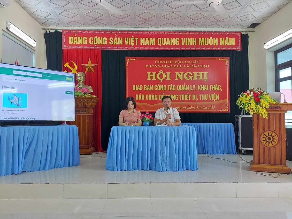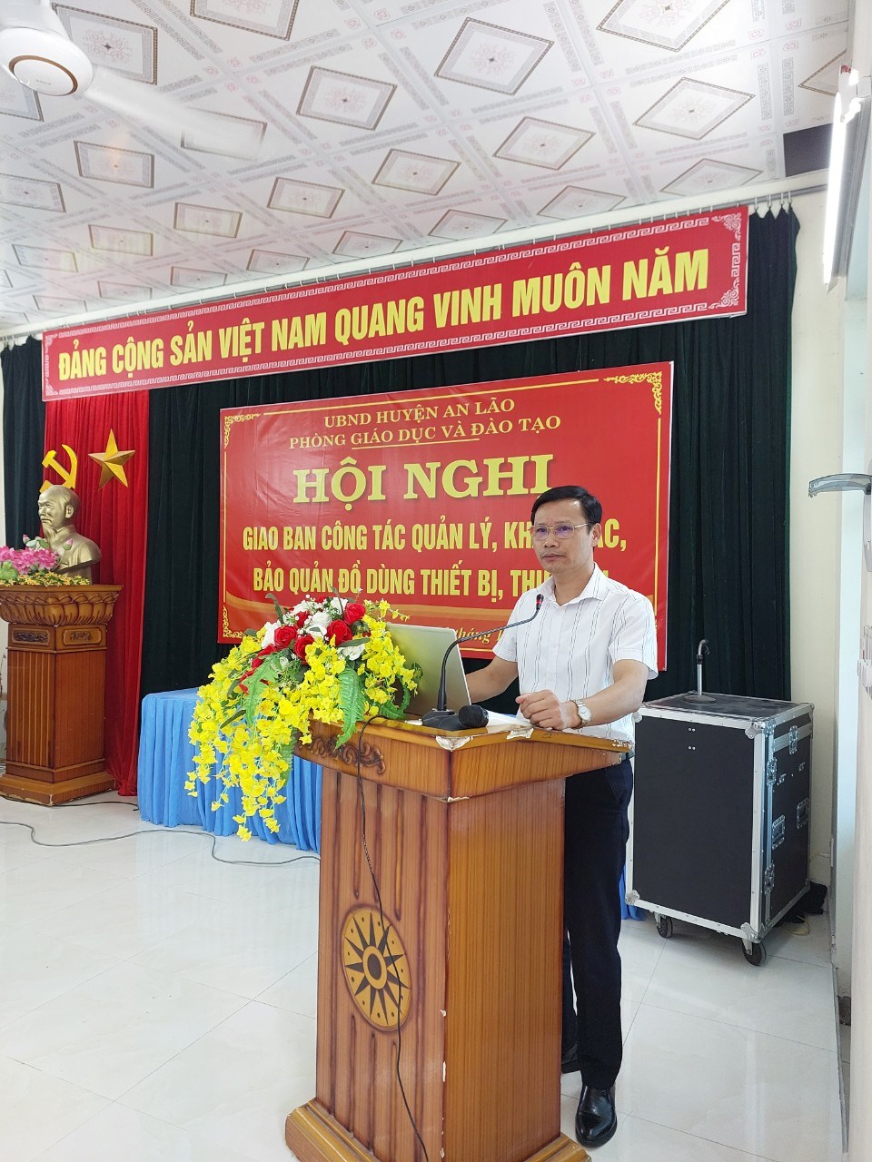 Thực hiên theo giấy mời số 386 ngày 27 tháng 10 năm 2023 của PGD ĐT huyên An Lão về việc tổ chức Hội nghị giao ban công tác quản lý, khai thác, bảo quản đồ dùng thiết bị, thư viện.