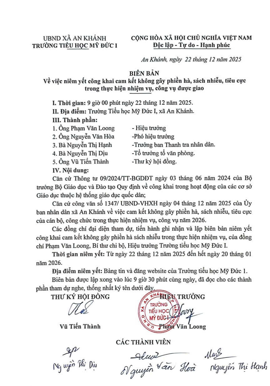 Biên bản công khai Cam kết không gây phiền hà sách nhiễu trong thực hiện nhiệm vụ của người đứng đầu
