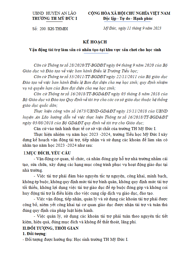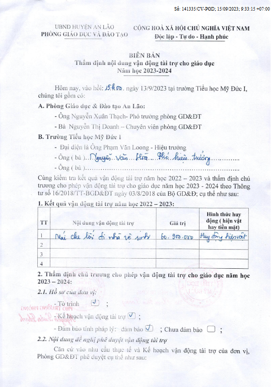 Ngày 15 tháng 9 năm 2023 Trường Tiểu học Mỹ Đức I đã được PGD& ĐT huyện An Lão về thẩm định nội dung Kế hoạch vận động tài trợ cho Giáo dục Năm học 2023-2024